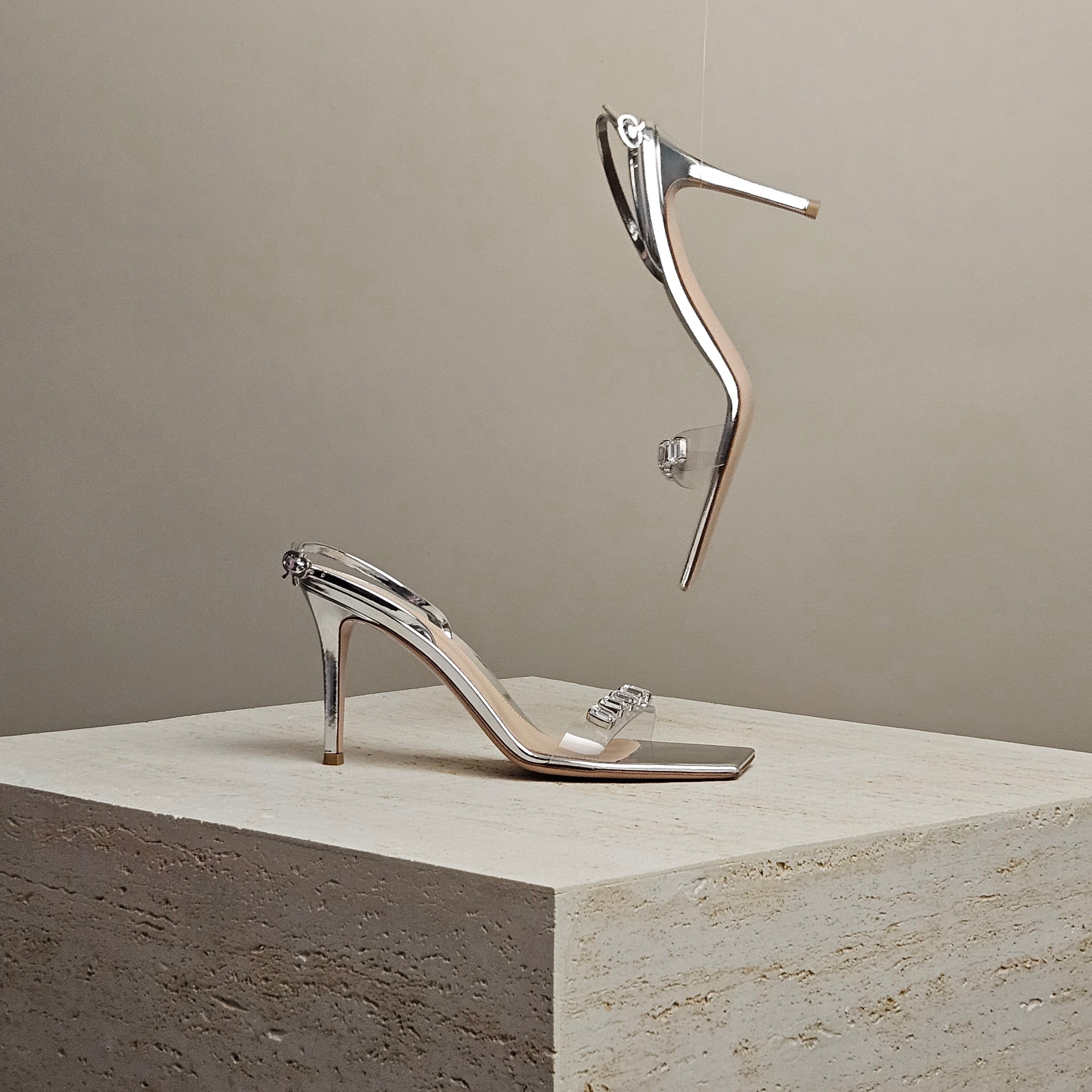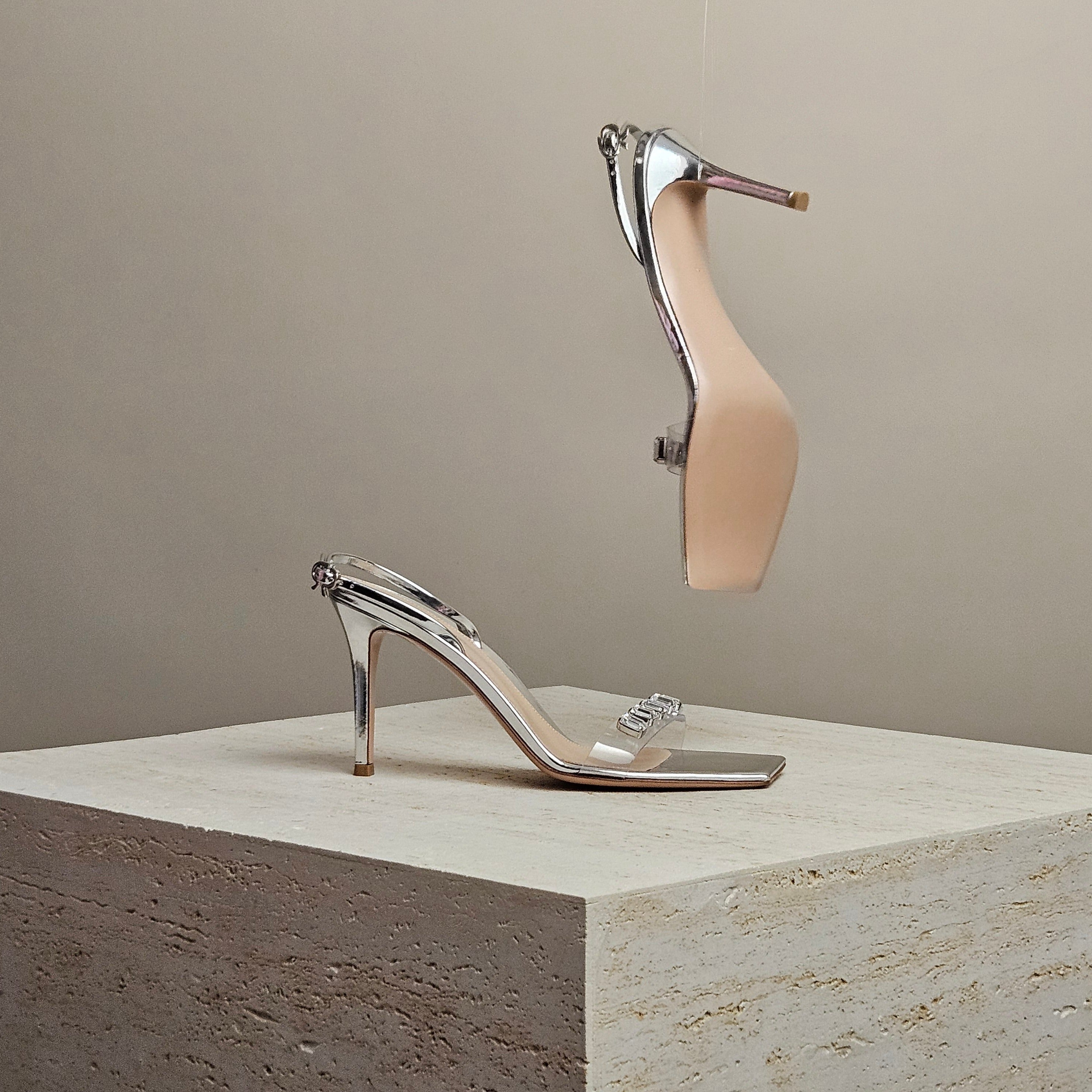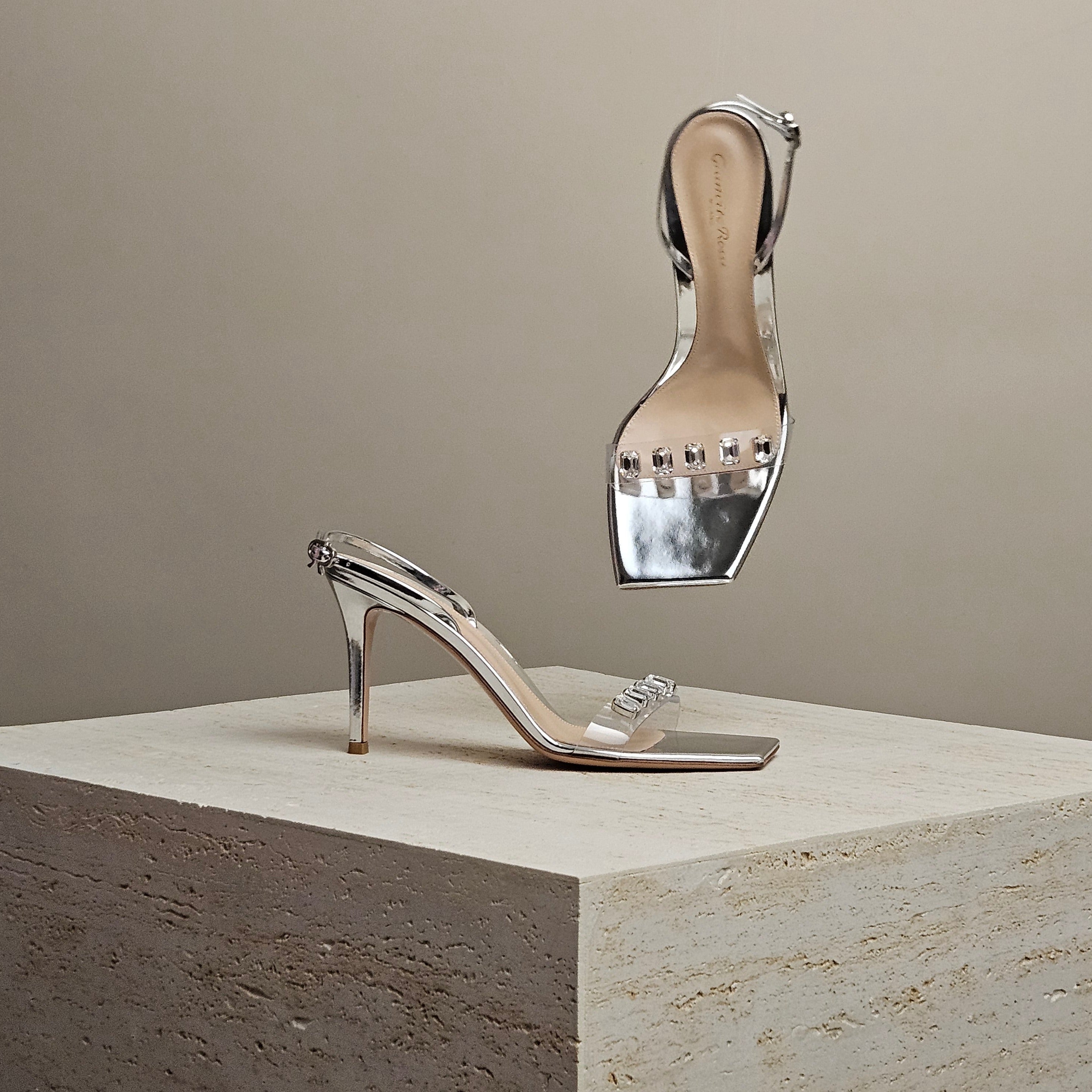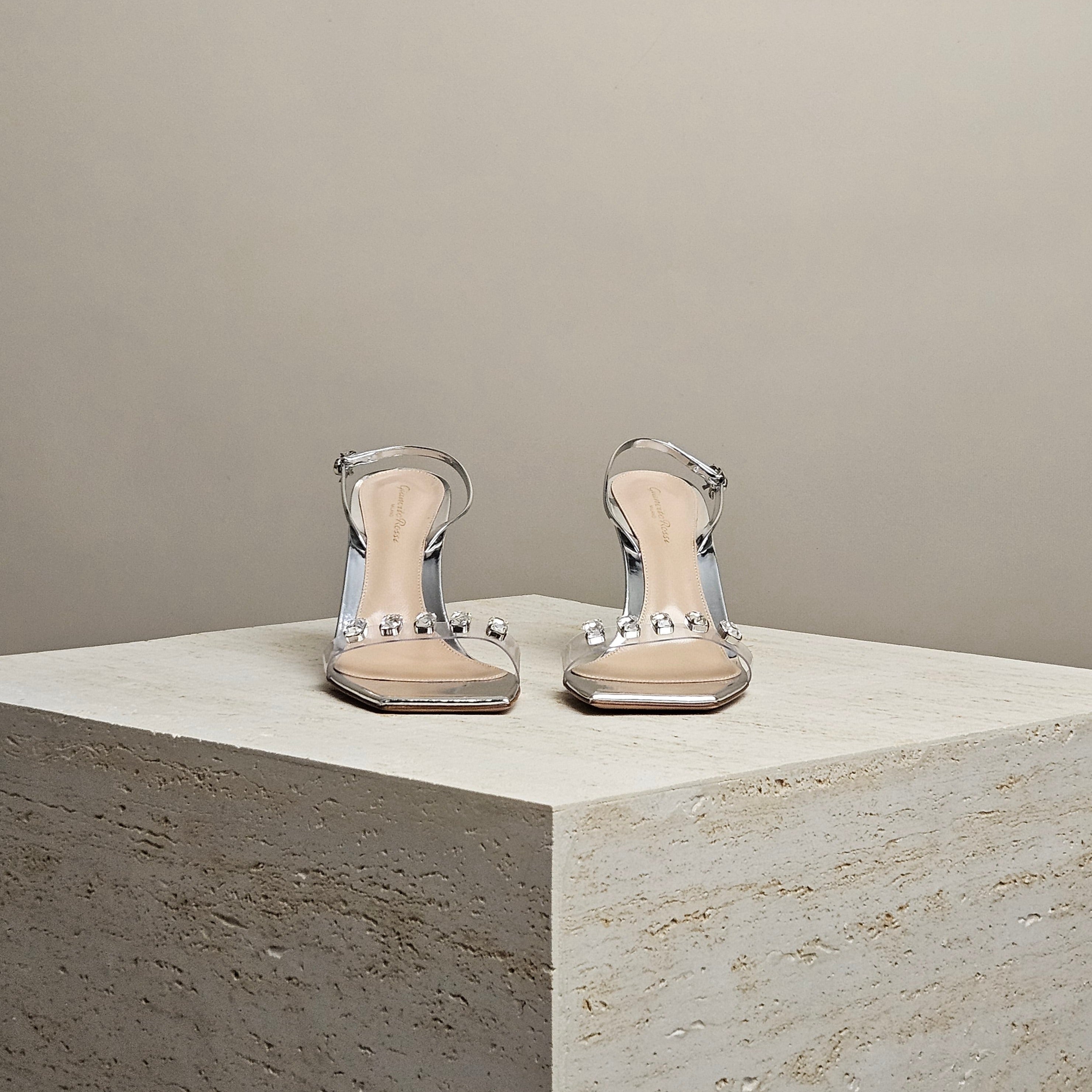 Get ready to dazzle in these Gianvito Rossi sandals! Made in Italy, they have a clear PVC strap that creates the illusion of sparkling crystals on your foot. The metallic silver leather adds a touch of shine and the square toes and adjustable slingback straps, complete with the signature bow buckle, ensure a perfect fit.
