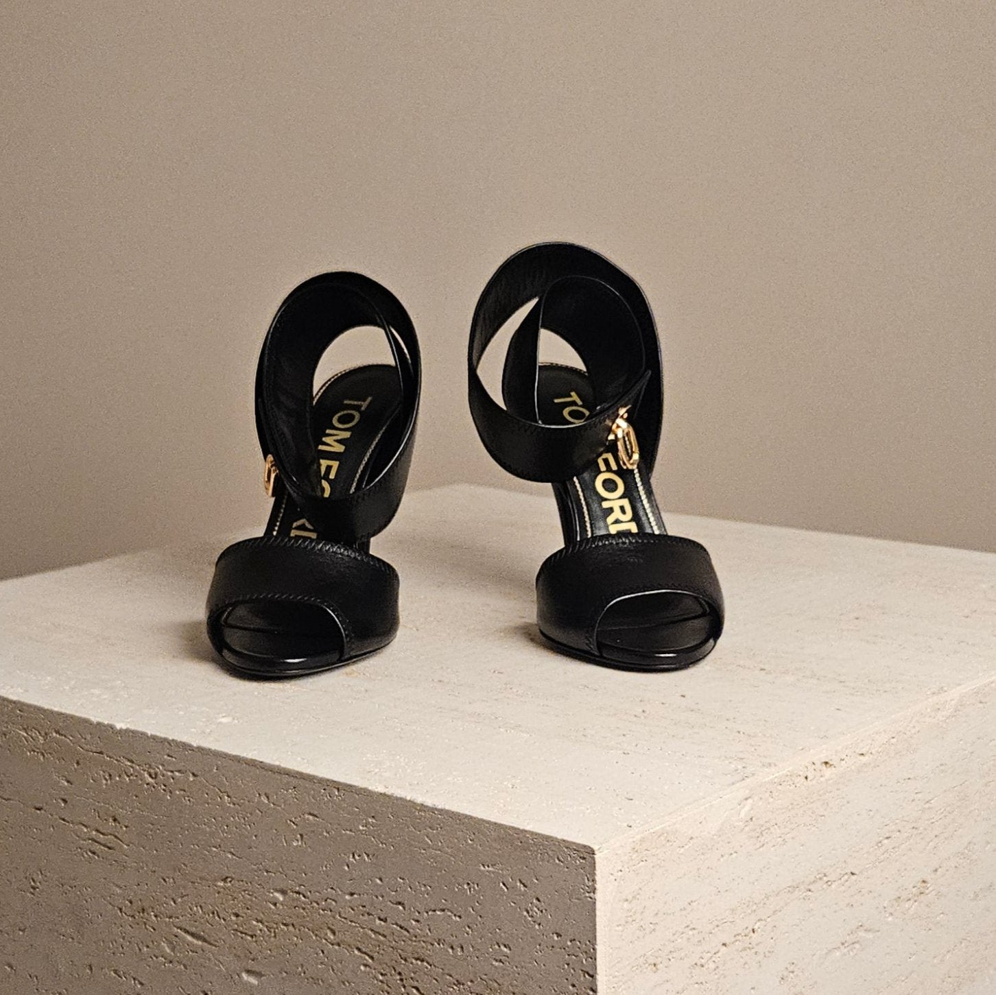 Experience the perfect blend of modern edge and glamorous opulence with Tom Ford's Black Ankle-Wrap Leather Sandals. The playful wrap-around strap and buckle closure add a unique element to this classic heel.