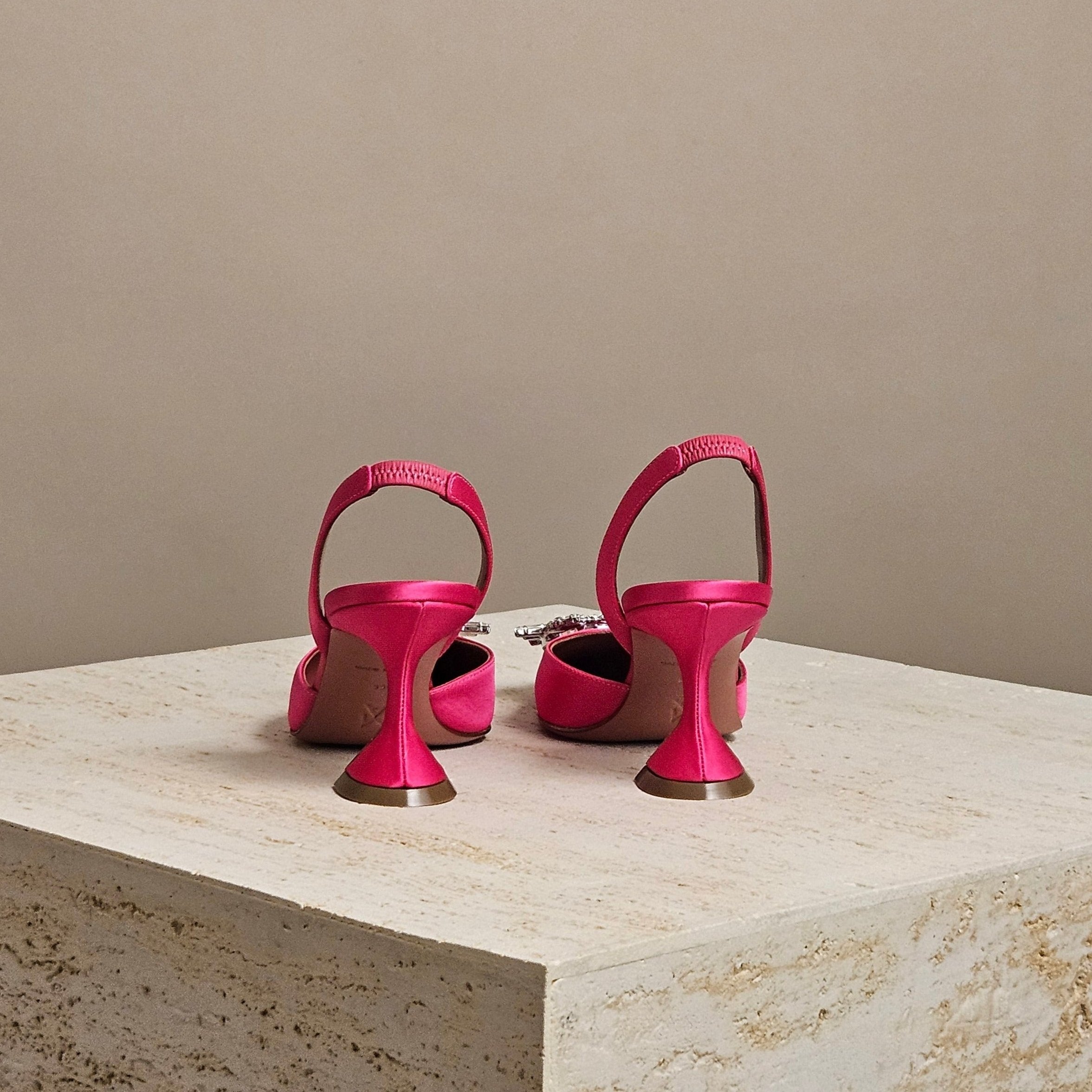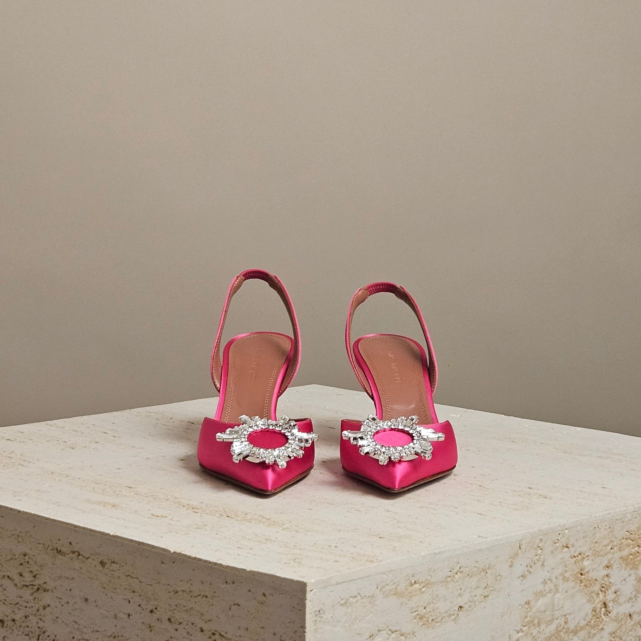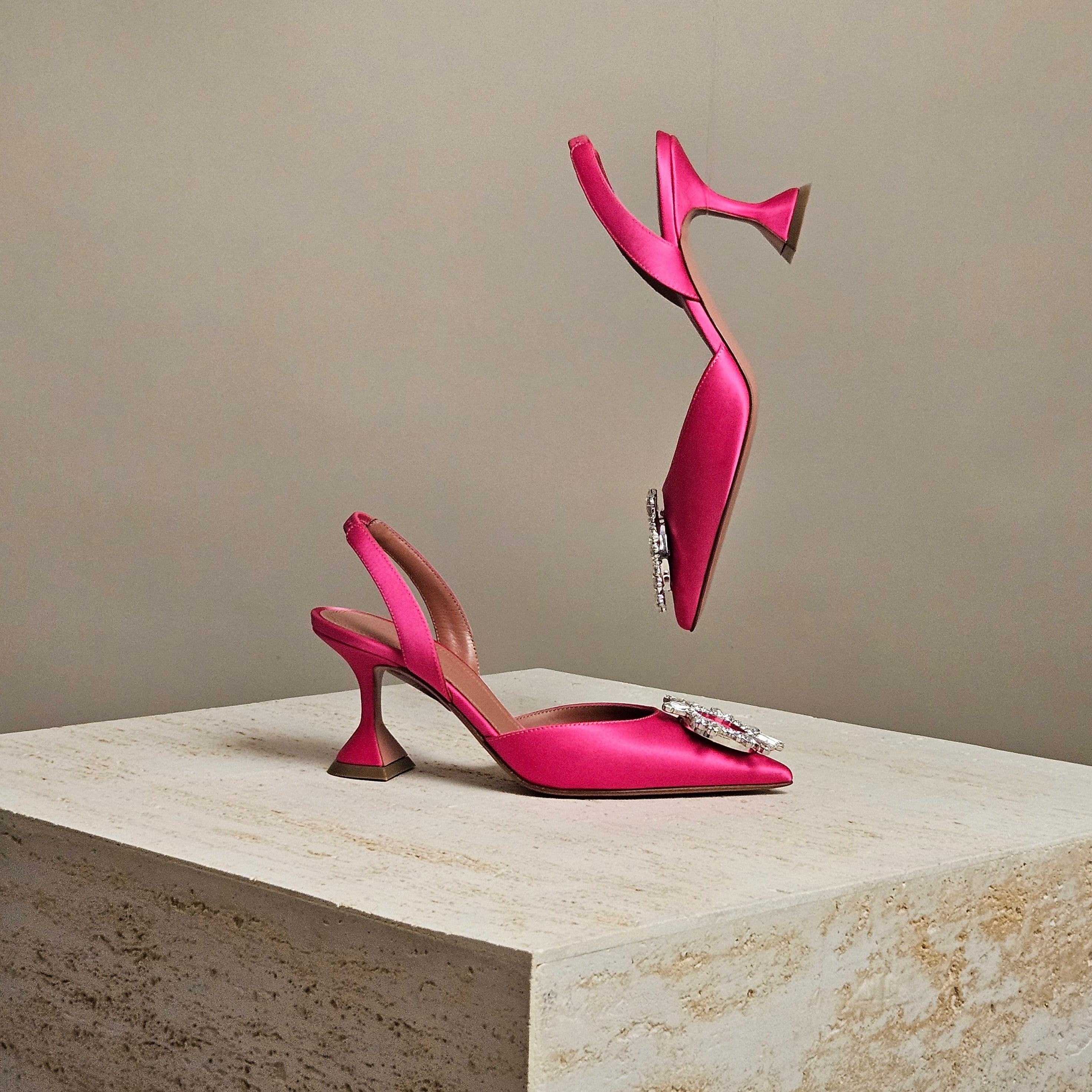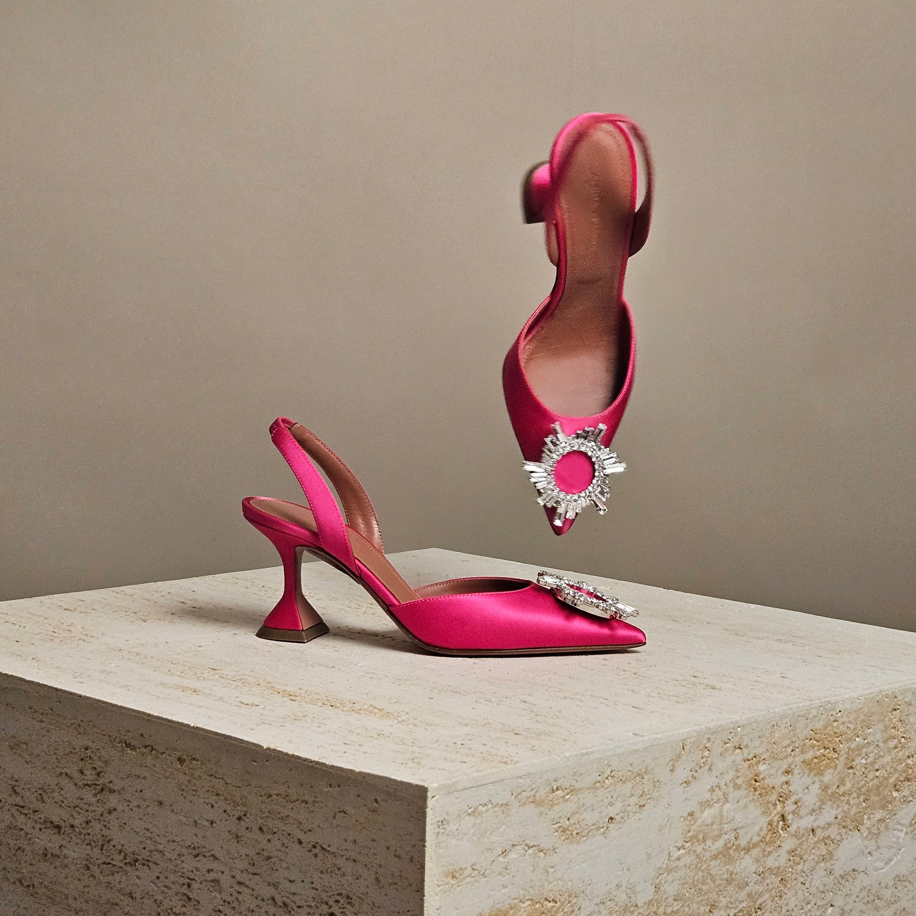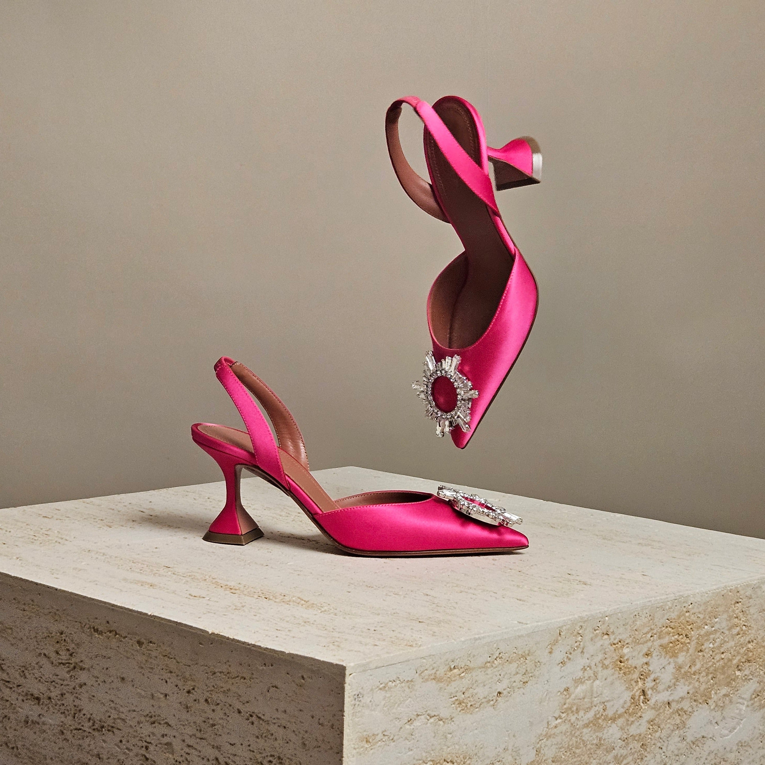Amina Muaddi's signature heels bring together the best of two worlds: glamour and comfort. Appearing on the Begum pumps, this lustrous satin style is detailed with crystal buckles to the pointed toes.