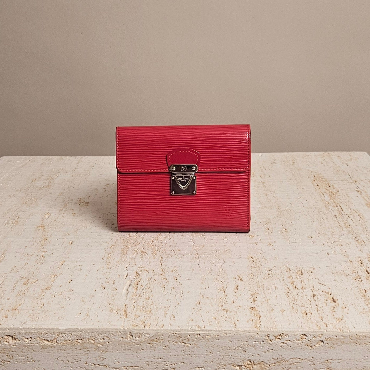 This Louis Vuitton small red Fold Wallet with Buckle keeps your cards and cash neatly organized, while the buckle adds a playful twist and a secure closure. Perfect for those who love stylish practicality, this wallet effortlessly combines convenience with a pop of vibrant luxury. Whether you're heading out or just stepping around town, this little gem promises to keep your valuables safe with a wink of style.