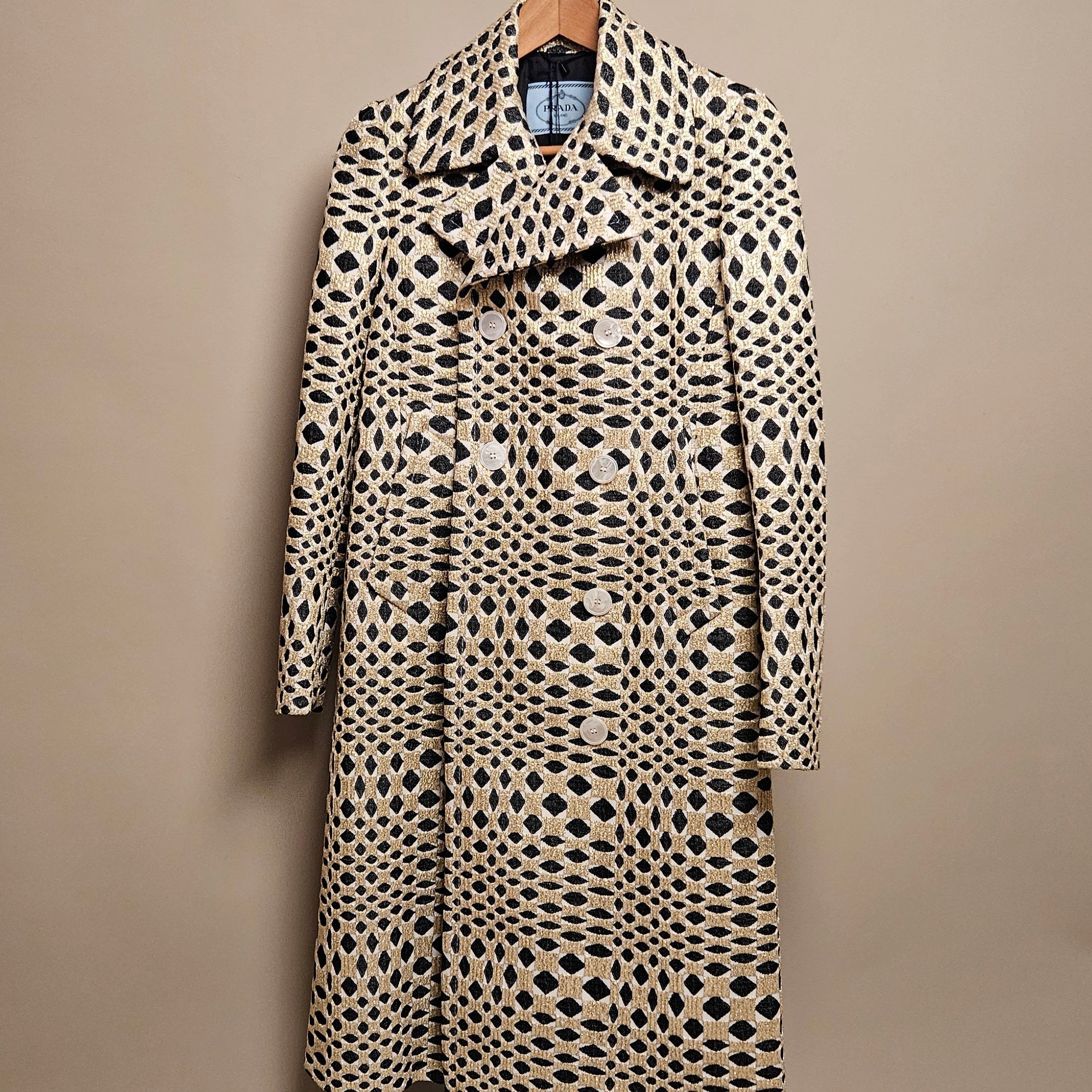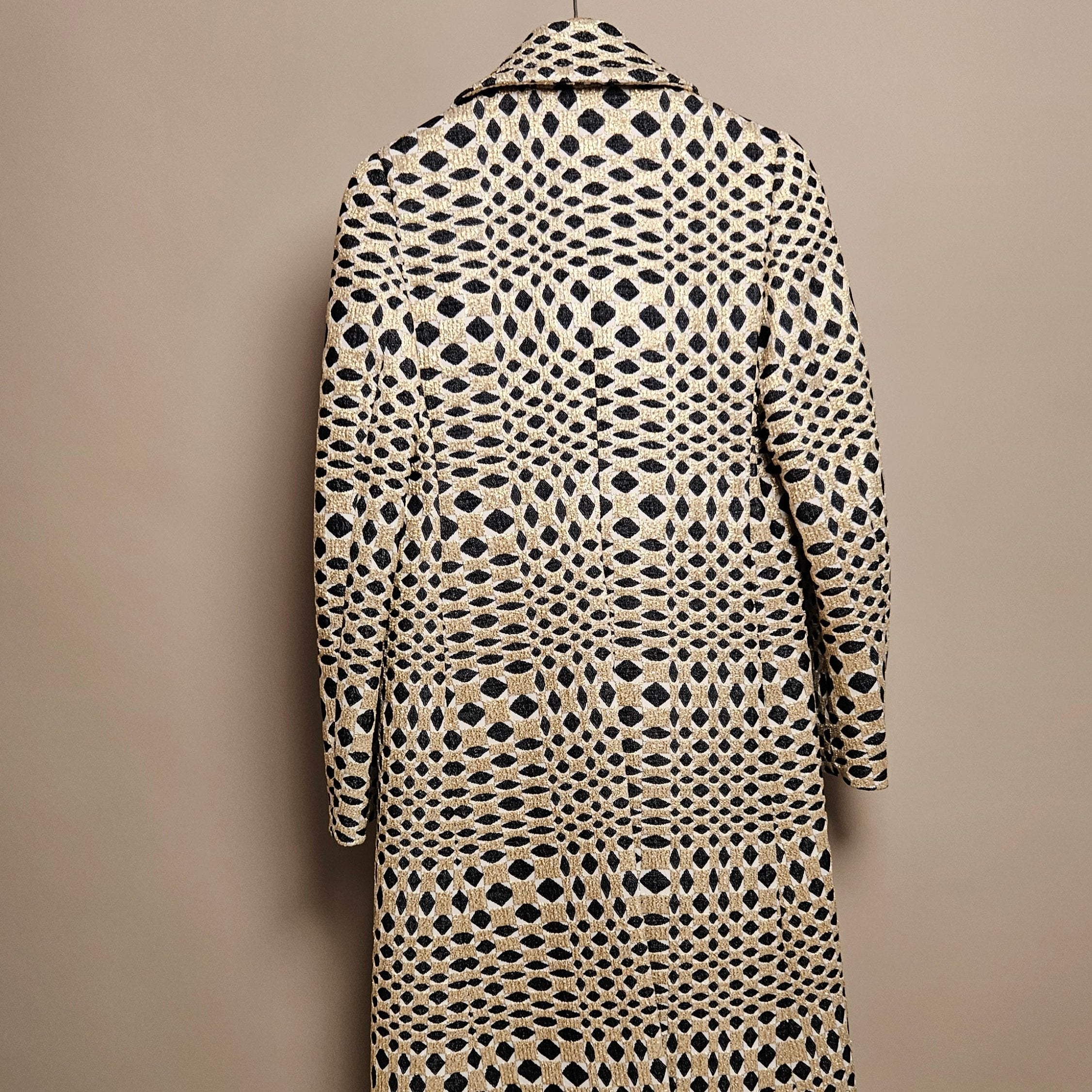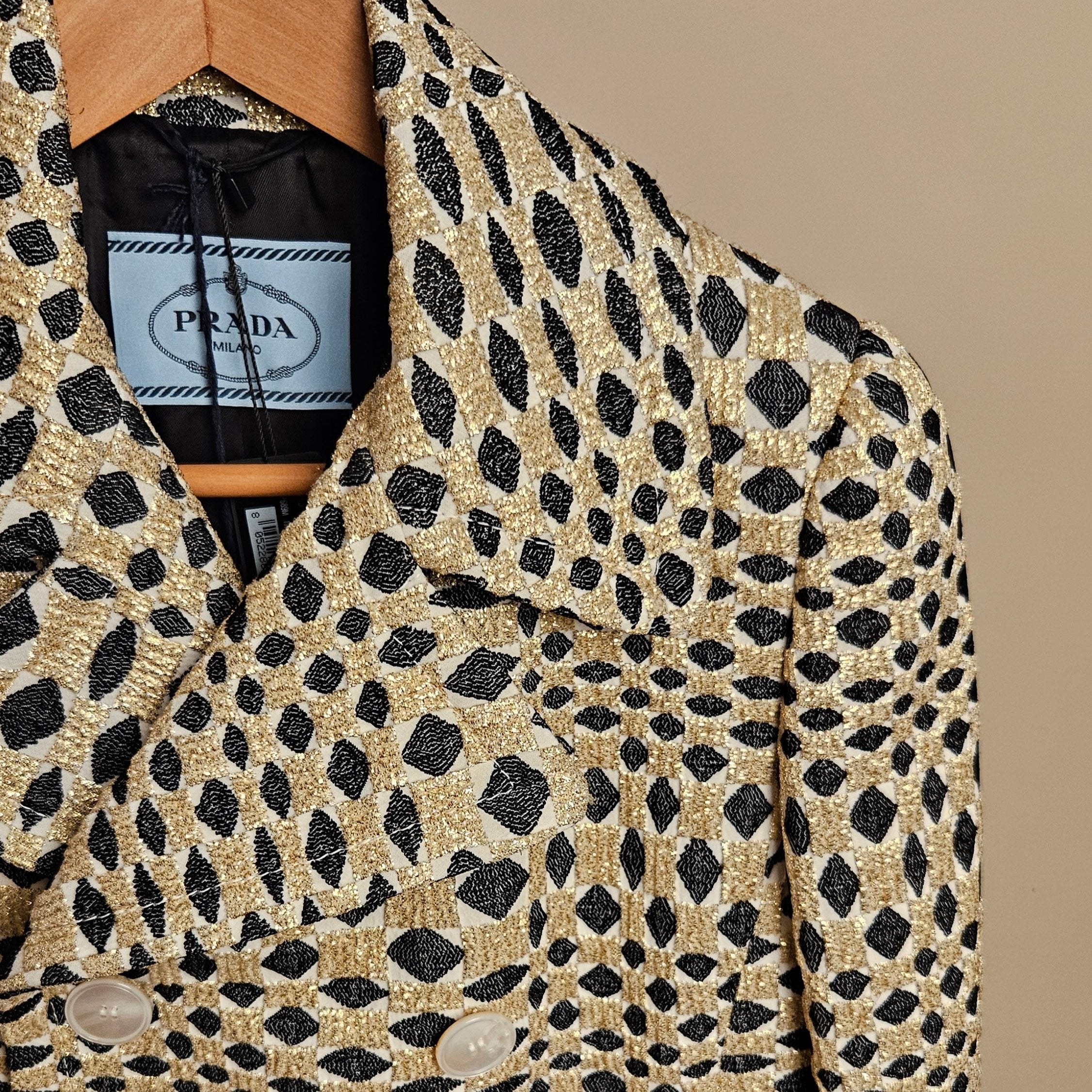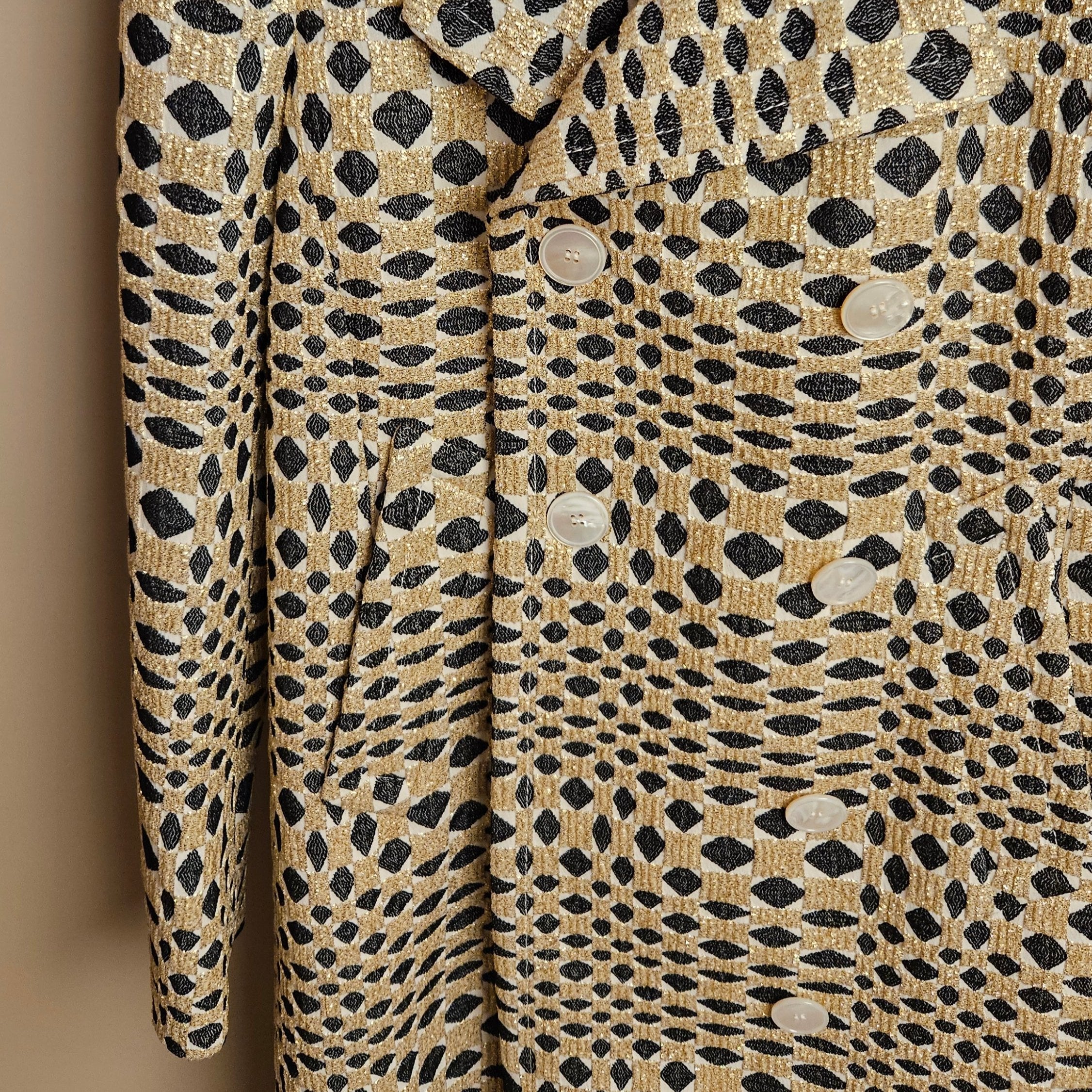 A luxurious coat crafted with intricate matelassé detailing in glamorous gold. This double-breasted statement piece exudes elegance and sophistication, adding a touch of opulence to any outfit. Whether worn over formal attire for a fancy event or paired with casual clothes for a chic daytime look, it's sure to impress with its striking allure.