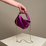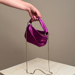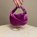 Add a touch of sophistication to your accessories with the Jimmy Choo Bonny Tote Bag in luxurious violet satin. Featuring a soft, lustrous finish and a unique twisted handle design, this tote combines elegance with modern flair. Perfectly sized for evening essentials or as a statement daytime piece, it’s the ultimate accessory for the woman who values style and versatility.