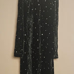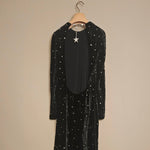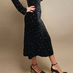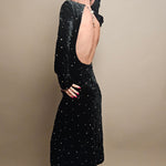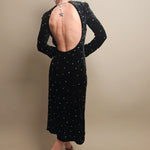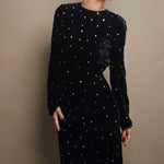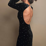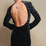 This dress exudes a chic and modern vibe, perfect for evening events, cocktail parties or special events. The combination of rich velvet, the open back and scattered diamante makes it a standout choice for those looking to make a fashionable statement.