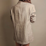 Crafted from high-quality hemp fabric, this blazer offers a unique texture that is both durable and breathable, making it perfect for year-round wear. The rich brown hue adds warmth and versatility, allowing you to effortlessly pair it with a variety of outfits. What sets this blazer apart is its exquisite shimmer detailing, which catches the light beautifully, adding a touch of glamour to your ensemble.