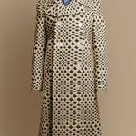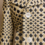 A luxurious coat crafted with intricate matelassé detailing in glamorous gold. This double-breasted statement piece exudes elegance and sophistication, adding a touch of opulence to any outfit. Whether worn over formal attire for a fancy event or paired with casual clothes for a chic daytime look, it's sure to impress with its striking allure.