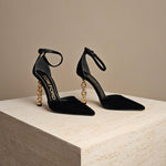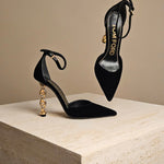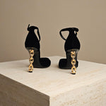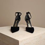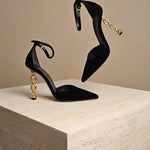 Exude bold sophistication with the Tom Ford Chain Trimmed Velvet Black Pump. Crafted from rich black velvet, these pumps feature a striking gold chain trim that adds a touch of edge to their elegant silhouette. With a pointed toe and sculpted heel, they combine luxury and modern flair, making them the perfect choice for evening events or dressing up any sophisticated look.