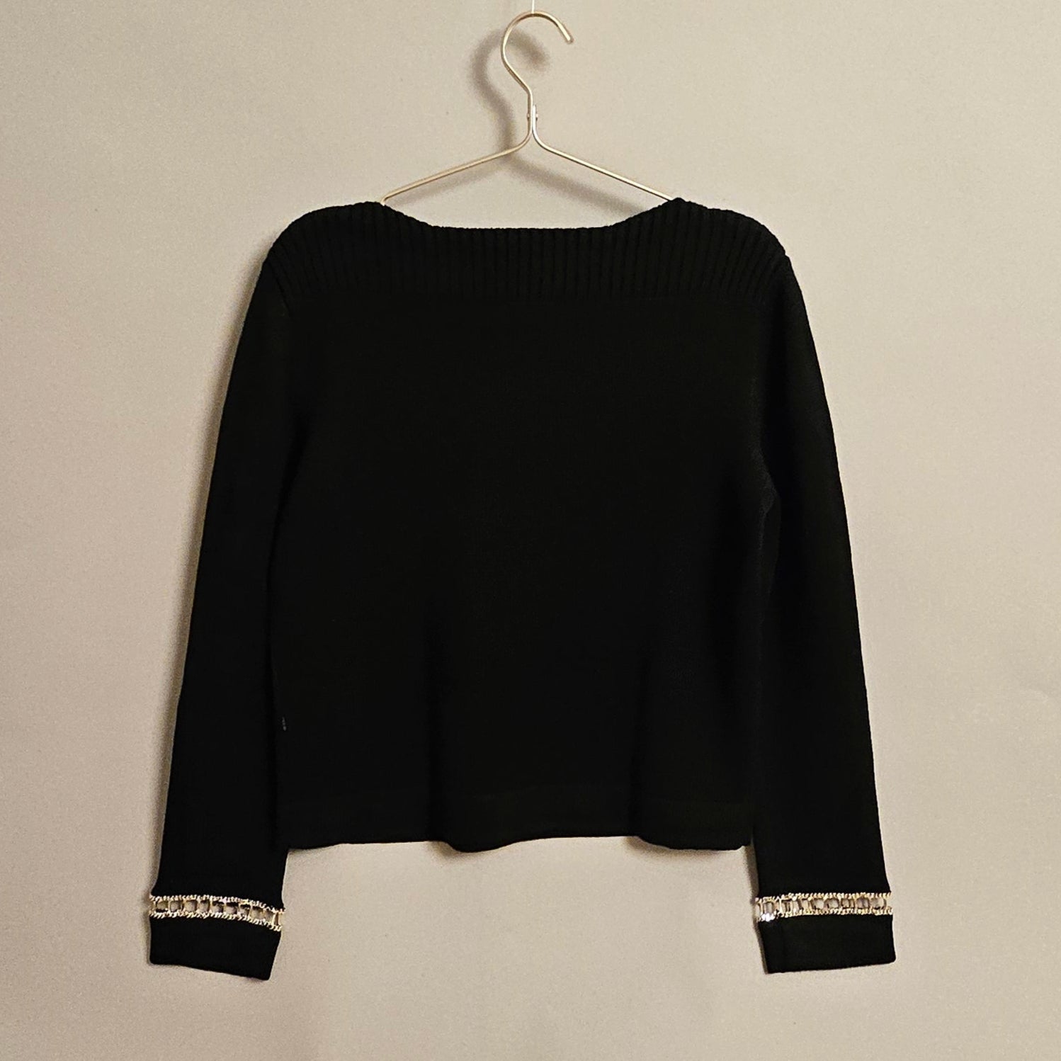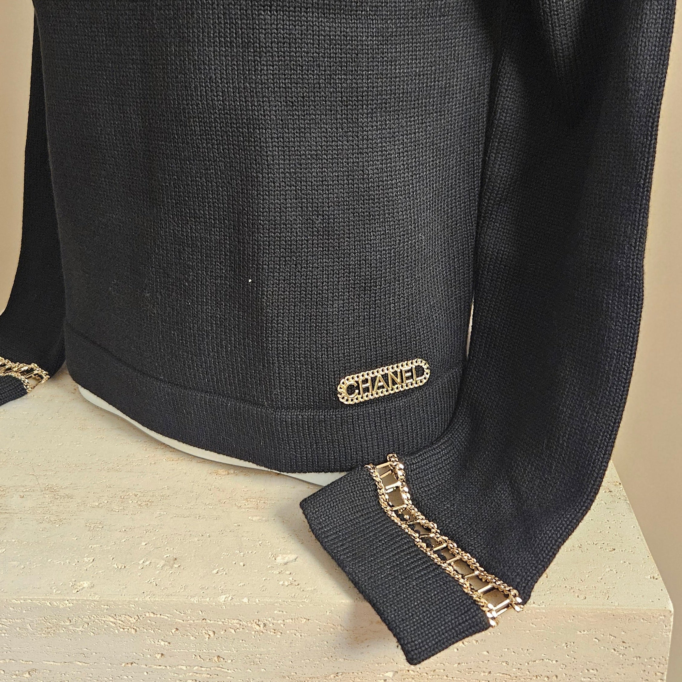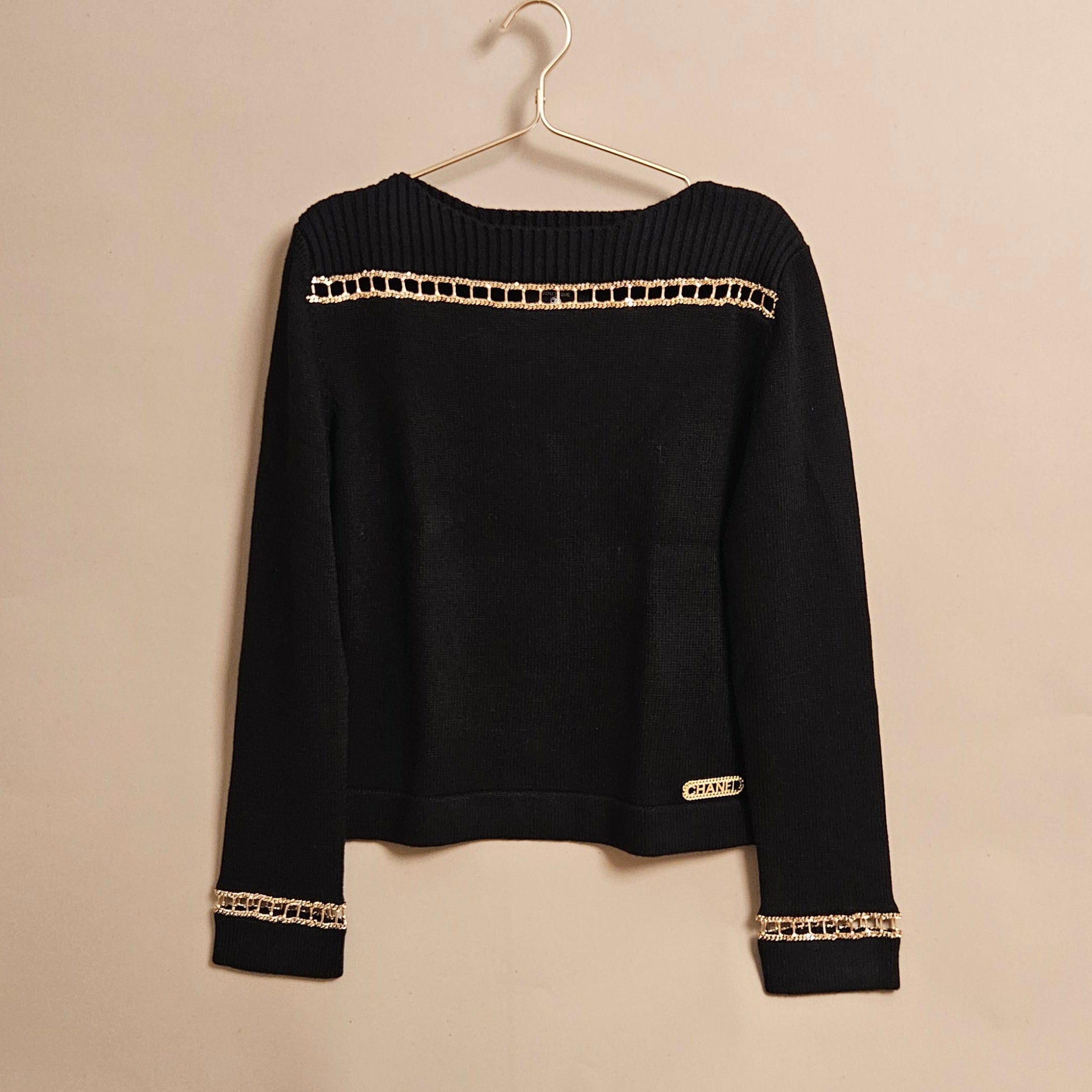 Step into effortless chic with the Chanel Chain-Trim Boat Neck Sweater in Black Cashmere. This exquisite sweater is crafted from luxurious black cashmere, ensuring both comfort and style. The boat neck neckline adds a touch of elegance and sophistication, while the chain trim detailing on the shoulders provides a modern twist.