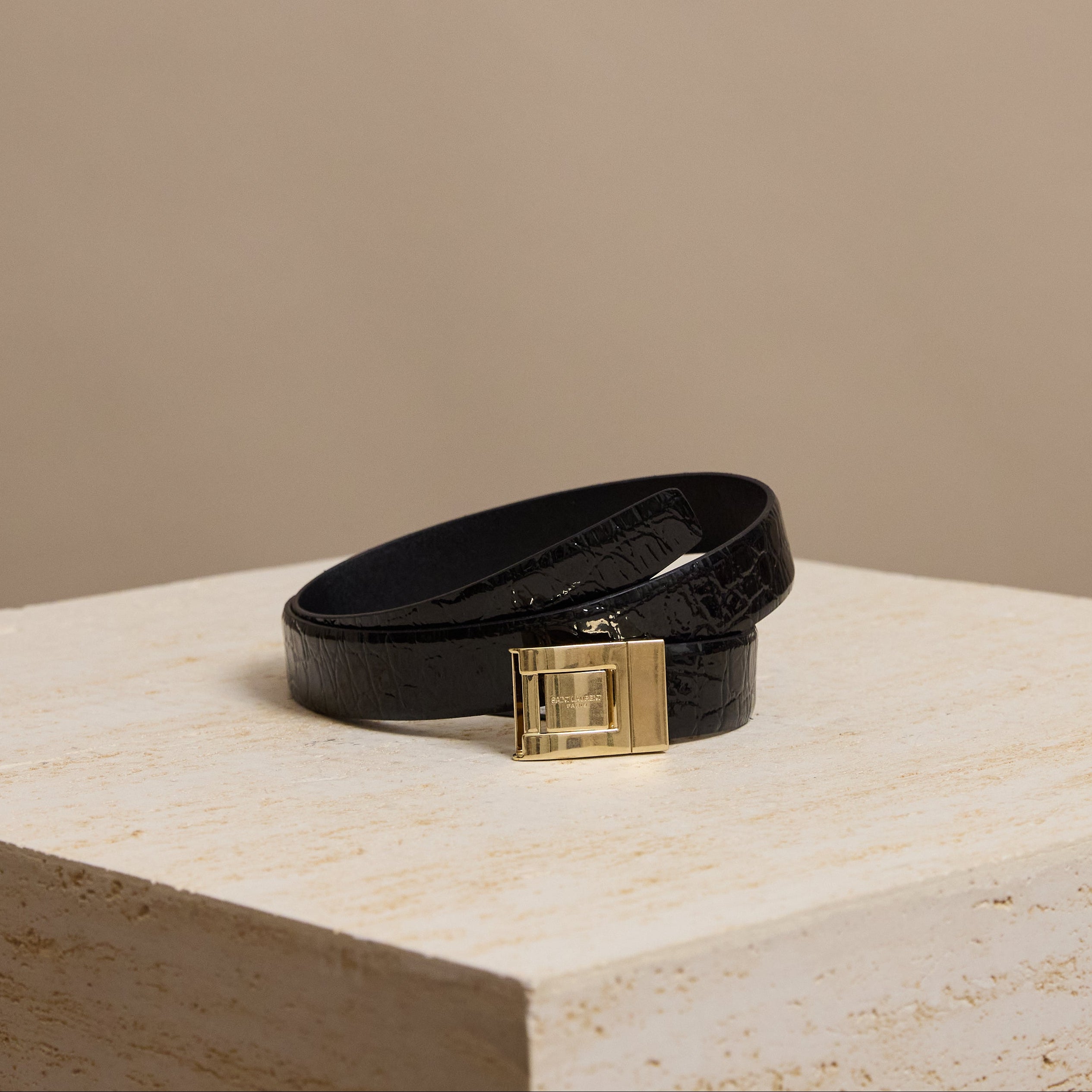 Elevate your everyday look with this stunning patent leather belt featuring a luxe gold buckle that catches the light beautifully. The sleek black finish pairs effortlessly with virtually any outfit—from tailored trousers to your favorite jeans. With its polished sheen and eye-catching hardware, this belt transforms a simple ensemble into something undeniably chic.