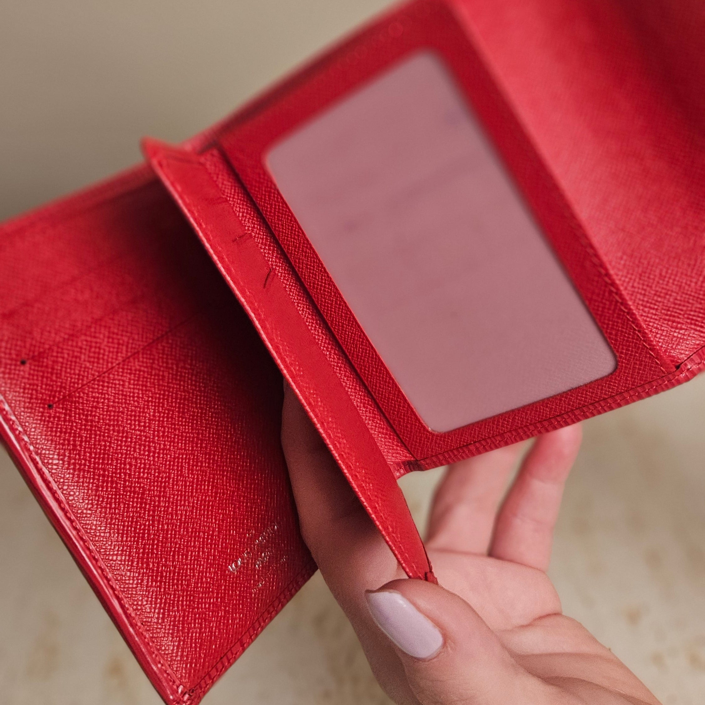 This Louis Vuitton small red Fold Wallet with Buckle keeps your cards and cash neatly organized, while the buckle adds a playful twist and a secure closure. Perfect for those who love stylish practicality, this wallet effortlessly combines convenience with a pop of vibrant luxury. Whether you're heading out or just stepping around town, this little gem promises to keep your valuables safe with a wink of style.
