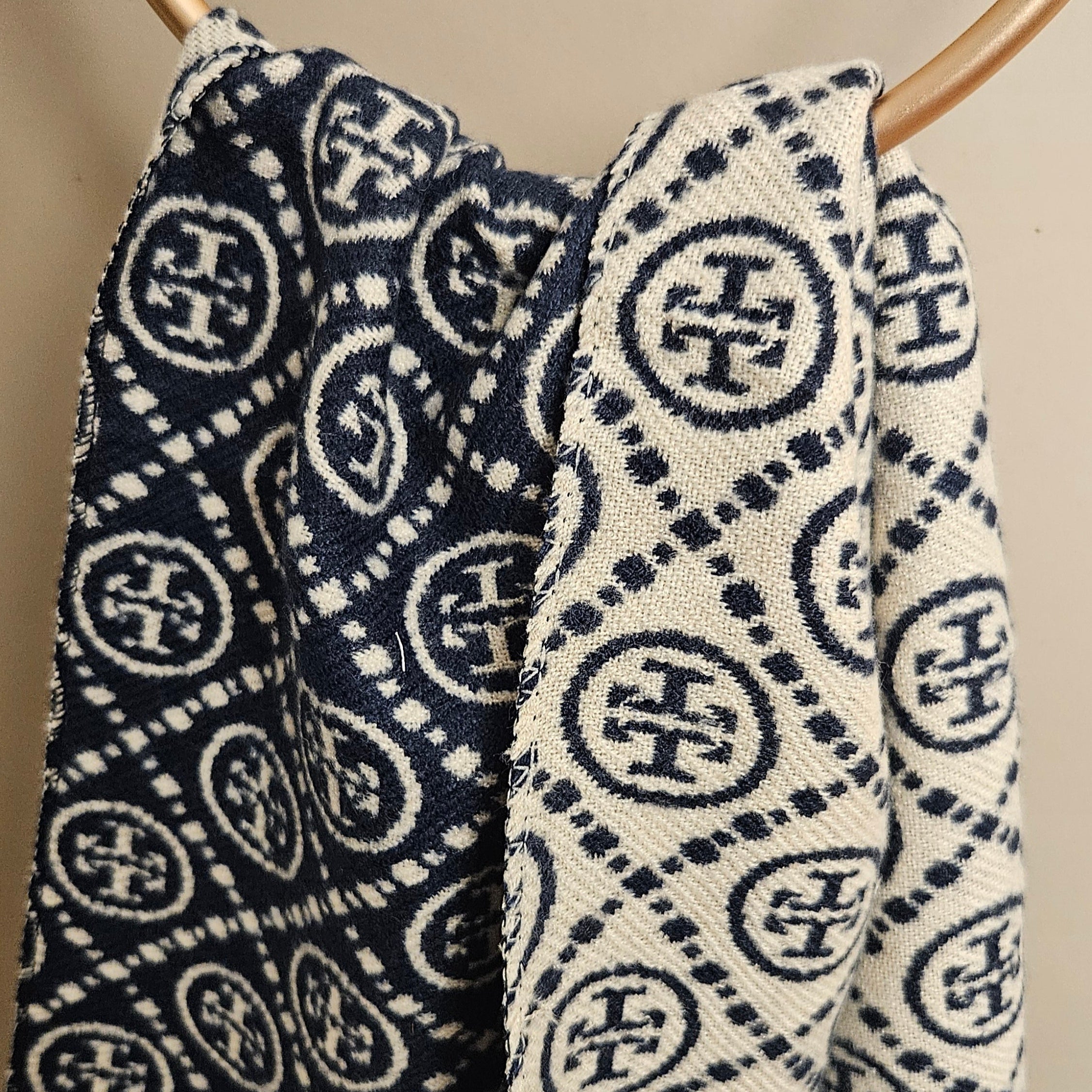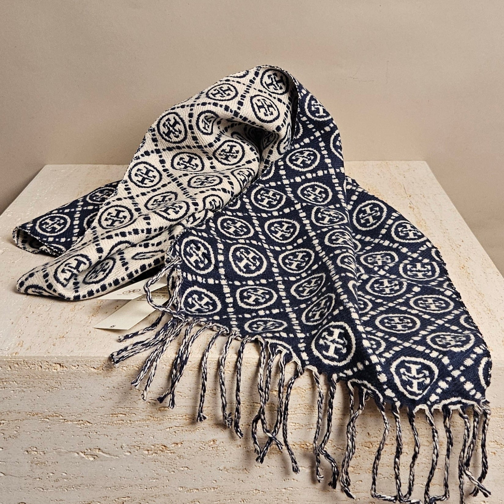 Wrap yourself in cozy charm with the Tory Burch Logo-monogrammed Wool-blend Scarf. This one-size wonder blends soft wool with a playful pattern of iconic logos, adding a dash of flair to any outfit. Perfect for chilly days, it keeps you warm while showing off a signature style that’s effortlessly fun. Whether tossed over your shoulders or snugly wrapped around your neck, this scarf turns everyday warmth into a playful statement.